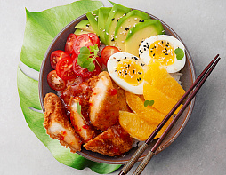 Основа на выбор, куриные стрипсы, томат черри, авокадо, апельсин, яйцо, кунжут, бульон вок, кунжутное масло
