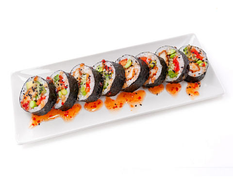 Тунец, перец халапеньо, салат айсберг, бекон, такуан, соус кисло-сладкий, кунжут