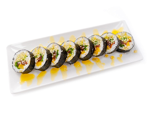 Тунец, перец халапеньо, салат айсберг, бекон, такуан, соус кисло-сладкий, кунжут